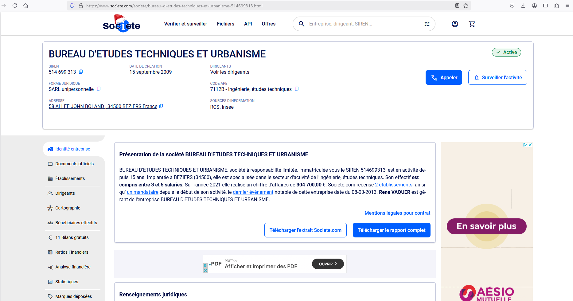 Ainsi, Monsieur René VAQUER élabore le projet de révision générale du Plan Local d’Urbanisme de Sérignan via la société Bureau d’Etudes Techniques et Urbanisme (BETU) sise La Courondelle – 58 allée John Boland – 34500 BEZIERS, dont il est le gérant.